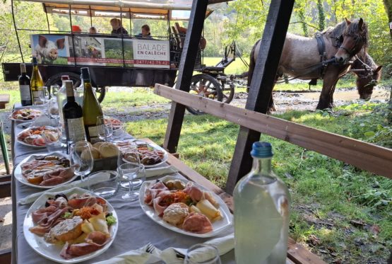 Nous n’oublions jamais nos amis les chevaux en emportant le foin nécessaire à leur bien être ! (Pas d’accès possible pour les fauteuils roulants dans les calèches, ce qui n’empêche pas d’embarquer les personnes à mobilité réduite)